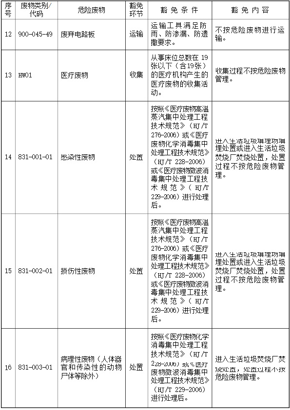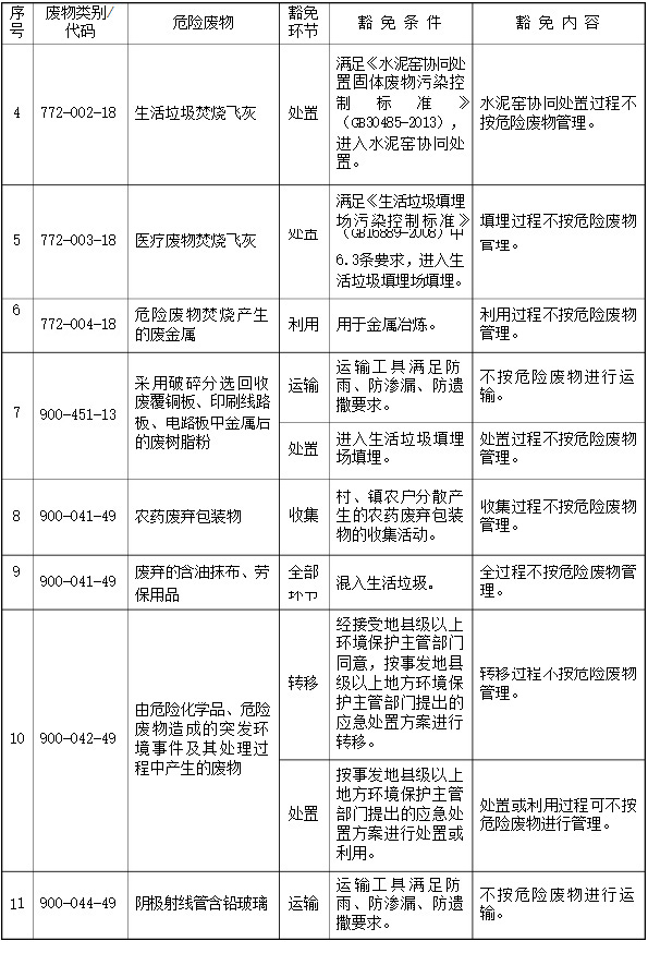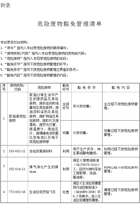 第五條 列入本名錄附錄《危險廢物豁免管理清單》中的危險廢物,在所列的豁免環(huán)節(jié),且滿足相應的豁免條件時,可以按照豁免內(nèi)容的規(guī)定實行豁免管理。
